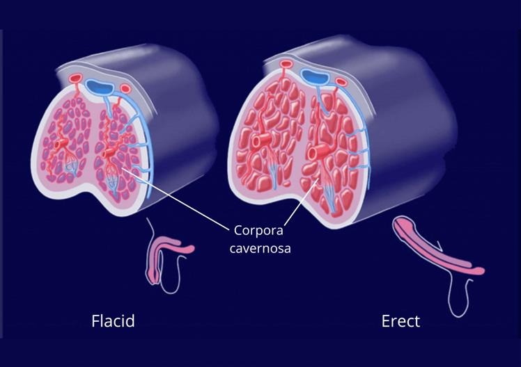 Erection takes place when the arteries of the penis carry blood and engorge the spongy erectile bodies called corpora cavernosa.