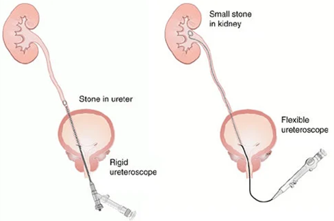 Flexible Ureterorenoscopy is now available and this flexible ureteroscope can be passed through the normal ureter opening all the way up on the kidneys and stones in the calyces of the kidney can be fragmented into fine particles using laser technology. This procedure required general anaesthesia, spinal or epidural anaesthesia. Hospitalization is generally for 1 or 2 days only.